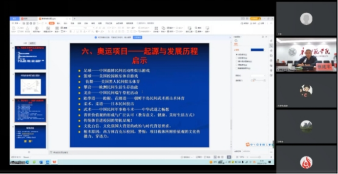 各位专家的讲座高屋建瓴、深入浅出,对我系的体育文化研究以及民族传统体育基地建设具有重要的指导意义,我系也将持续开展学术交流活动,积极推进省一流体育学院建设。
