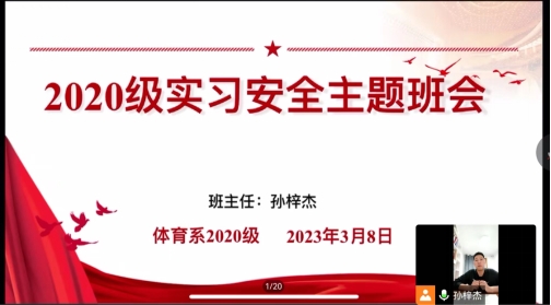 2023年3月8日,20级体育教育及社会体育管理与指导的同学们参与了主题为实习安全教育为主题的主题班会,孙梓杰老师在会上就同学们实习的问题作出了进一步的强调。