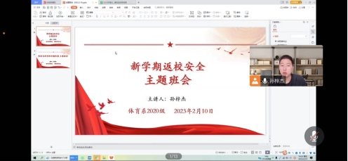 新的学期,为了使同学们能够平安顺利的返校,增强安全意识,孙梓杰老师于2月10日于腾讯会议为体育教育专业20级全体学生开展了返校前安全教育主题班会。与即将返校的学生们云端相见。