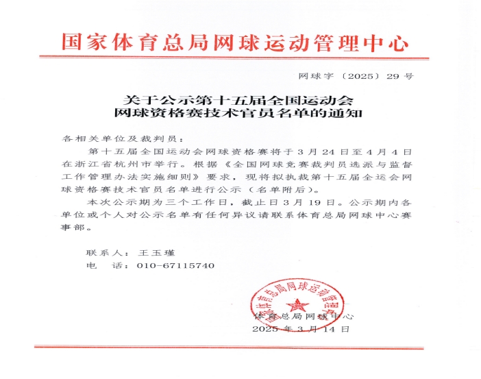 全国运动会简称“全运会”,是中国国内水平最高、规模最大的综合性运动会。全运会的比赛项目除武术外基本与奥运会相同,旨在为国家奥运战略锻炼新人、选拔人才。全运会每四年举办一次,通常在奥运会年前后举行。第十五届全国运动会网球项目资格赛近期将在在杭州举行。我系果召全教师经国家体育总局选拔,被选派担任此次比赛的裁判工作,展现了其扎实的专业素养和执裁能力。