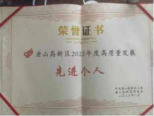 在2022年,左卫刚同志被评为唐山高新区2022年度高质量发展先进企业及先进个人,在不断努力、不断坚持、不断地创新中,一次次的突破,使自己离成功更近一步!