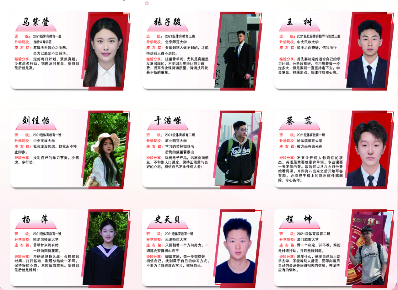 在考研上岸群体中,两位学子的备考故事尤为励志。21 级体育教育三班张子骏自确定考研目标后,便聚焦北京师范大学展开精准备考:历经数月刷题攻坚夯实基础,通过反复复盘错题查漏补缺,更借助模拟面试打磨表达逻辑,凭借坚韧毅力与科学方法,成功叩开理想高校大门,为未来学术深耕与教育领域发展筑牢根基。21 级社会体育指导与管理三班王树,则以 “深耕细作” 的态度突破备考难关,每天坚持 10 小时高强度学习,针对英语薄弱环节逐点攻克,面对专业知识盲区反复研读教材、请教师长,最终实现升学目标。